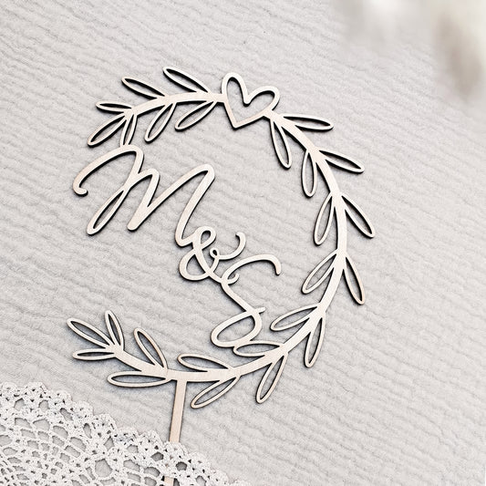 Cake Topper Hochzeit offener Blätterkranz mit Herz * personalisiert mit Initialen * Holz | Acryl