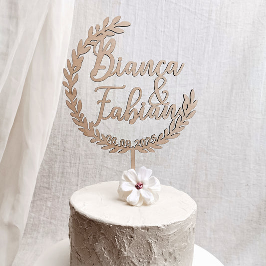 Cake Topper Hochzeit offener Blätterkranz * personalisiert mit Vornamen & Hochzeitsdatum