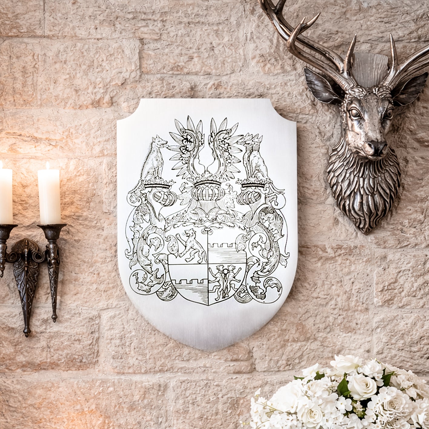 Familienwappen auf Edelstahl * Personalisiert mit Ihrem Wappen & Text * Wappenform