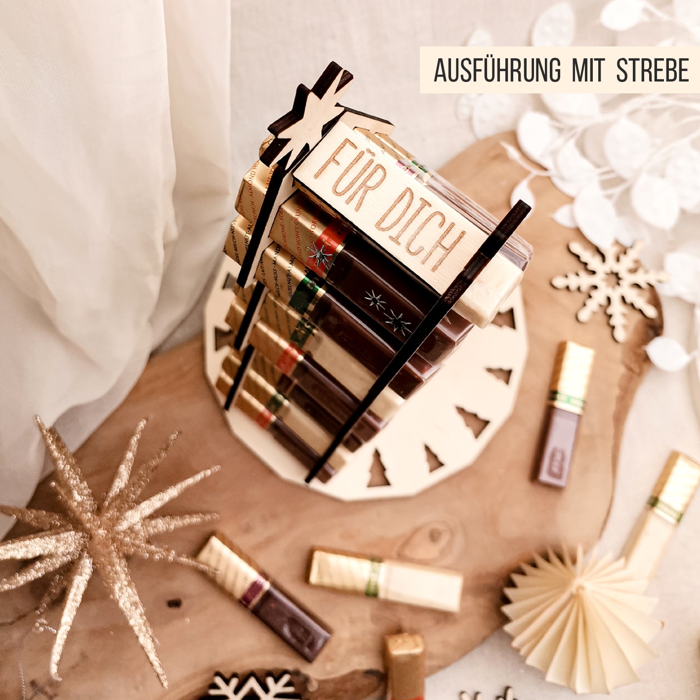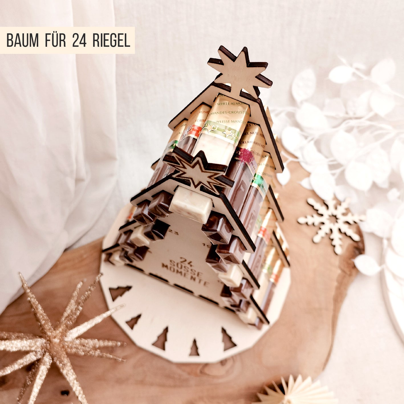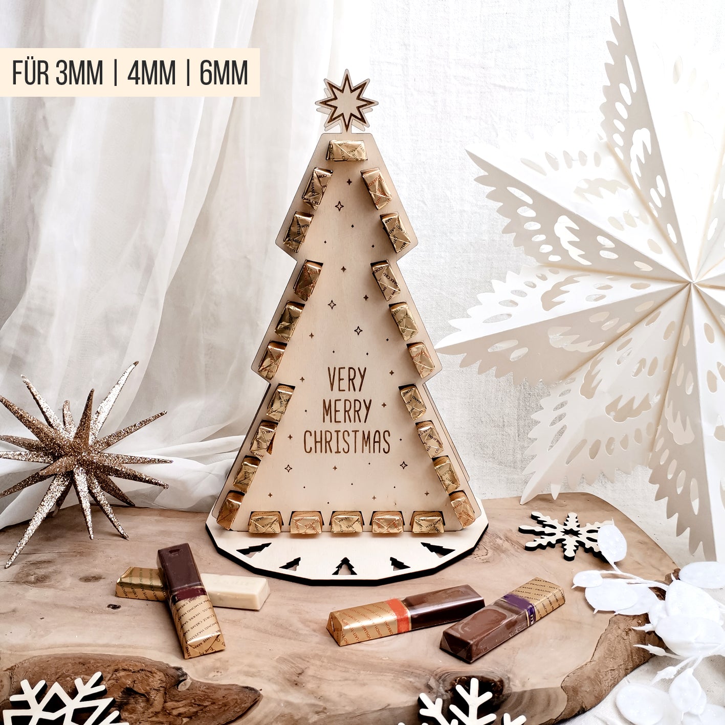 Diese Datei enthält einen wundervollen Weihnachtsbaum Adventskalender für Erwachsene und Kinder in den Sie 24 Schokoriegel stecken können. Die Ausschnitte passen genau für die abgebildeten gold-transparent eingewickelten Schokoriegel. Sie erhalten den Kalender für 3mm, 4mm und 6mm Materialstärke und mit jeweils 2 Platten (blank und mit ausgeschnittenen kleinen Tannen). Entscheiden Sie Sich für das dekorative Sterne Design und oder die täglichen Zahlen und wählen Sie aus verschiedenen deutschen weihnachtlichen Texten: FROHE WEIHNACHTEN, 24 SÜSSE MOMENTE, 24 KLEINE FREUDEN und englischen Texten: VERY MERRY CHRISTMAS, 24 SWEET MOMENTS, 24 LITTLE DELIGHTS. Natürlich erhalten Sie den Baum auch ´leer´ und können ihn gerne mit eigenen Texten, Namen, Zahlen und Designs personalisieren. Für einen Baum benötigen Sie immer 2 Baum-Teile die Sie mit der Platte mit handelsüblichem Kleber (Holzleim) verkleben. Optional finden Sie in der Datei eine Auswahl an Streben (kleben), mit der Sie Ihren Baum oben etwas stabilisieren können, wenn Sie dies möchten. Sie dürfen die Ausschnitte jederzeit auch an andere Schokoriegel selbst anpassen.