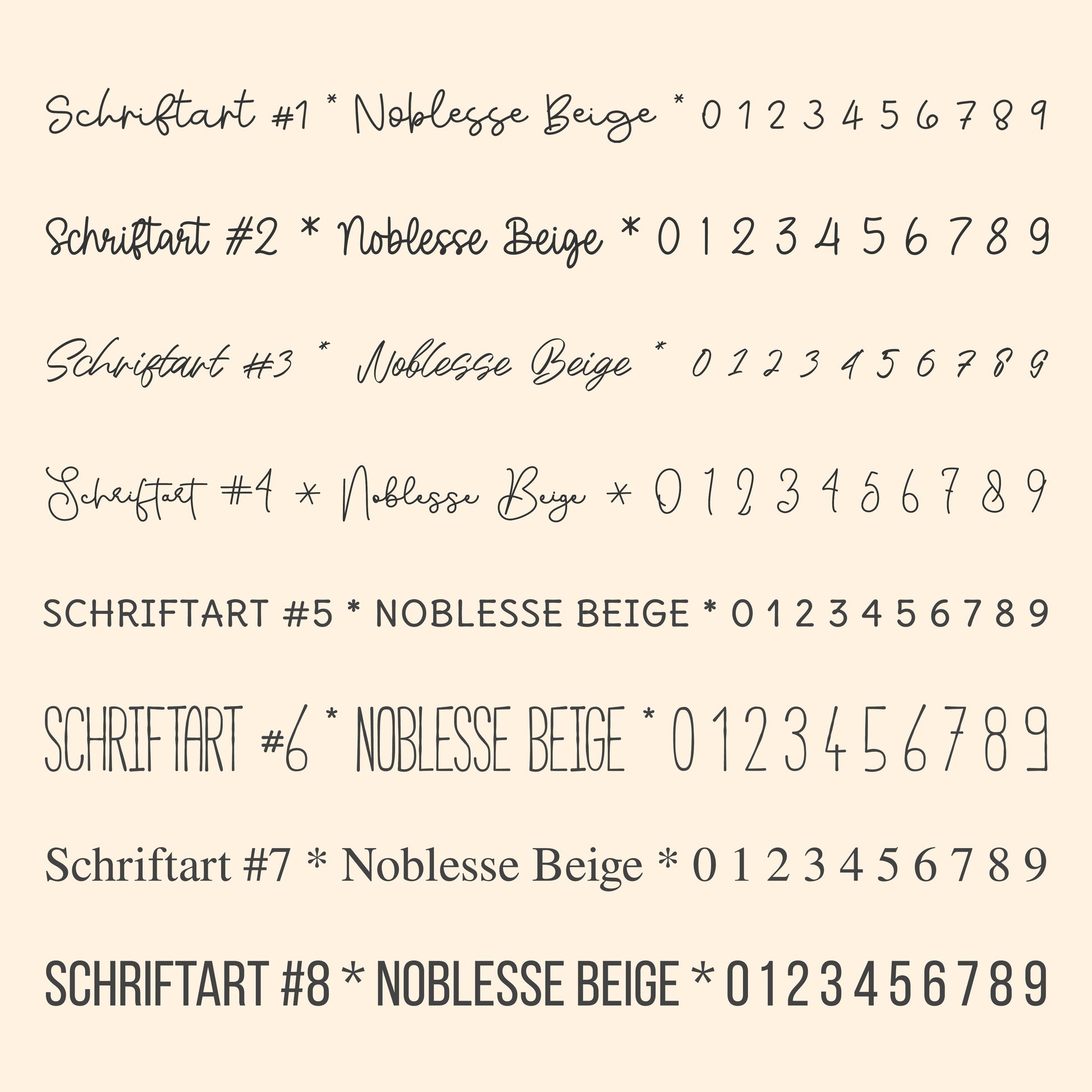 Andere Größen, Farben und Schriftarten sind jederzeit auf Anfrage möglich.