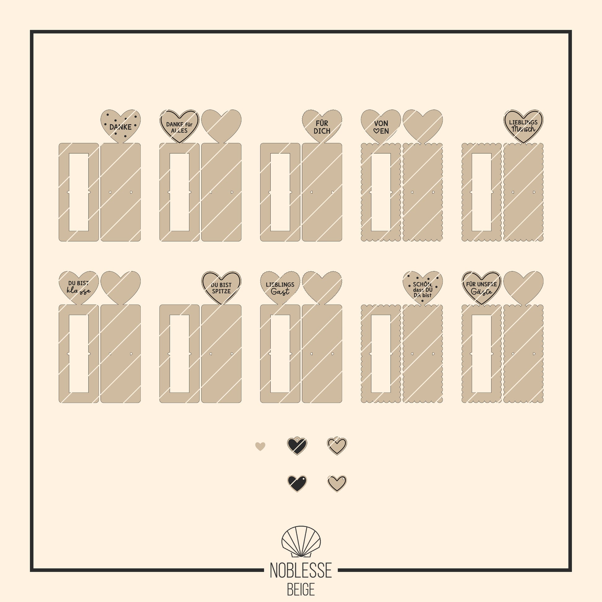 In dieser Datei erhalten Sie ein riesiges Bundle von eleganten Herz Schokoladeriegel Haltern mit Anhängern, die Sie als Mitbringsel, Gastgeschenk oder Kleinigkeit perfekt verschenken können. In unsere Halter passen übrigens gleich 3 namhafte Schokoriegel (gold-transparent verpackte Riegel, rosa Joghurt Riegel, weiß-rot verpackte kleine Riegel für Kinder). Unsere Halter sind immer zweiteilig und bestehen aus einer Vorderseite und einer Rückseite, die Sie zusammenkleben müssen. Die Riegel selbst können Sie durch 2 integrierte Löcher mit einem Band sicher festbinden und den Halter mit den 4 enthaltenen Herz Anhängern, dem kleinen Herz oder einem kleinen Sträußchen Trockenblumen verzieren. Sie bekommen die Halter mit Herz in 10 unterschiedlichen Designs (Herz, Muschelherz, Muschelrand, Herz-Kontur, Punkte, ...), die Sie individuell mit eigenen Texten oder Namen personalisieren können. Außerdem erhalten Sie in unserem Bundle für jedes Design vorgefertigte passende Texte: DANKE, DANKE FÜR ALLES, FÜR DICH, VON HERZEN, LIEBLINGS MENSCH, DU BIST KLASSE, DU BIST SPITZE, LIEBLINGS GAST, SCHÖN DASS DU DA BIST, FÜR UNSERE GÄSTE (insgesamt 100 Varianten).