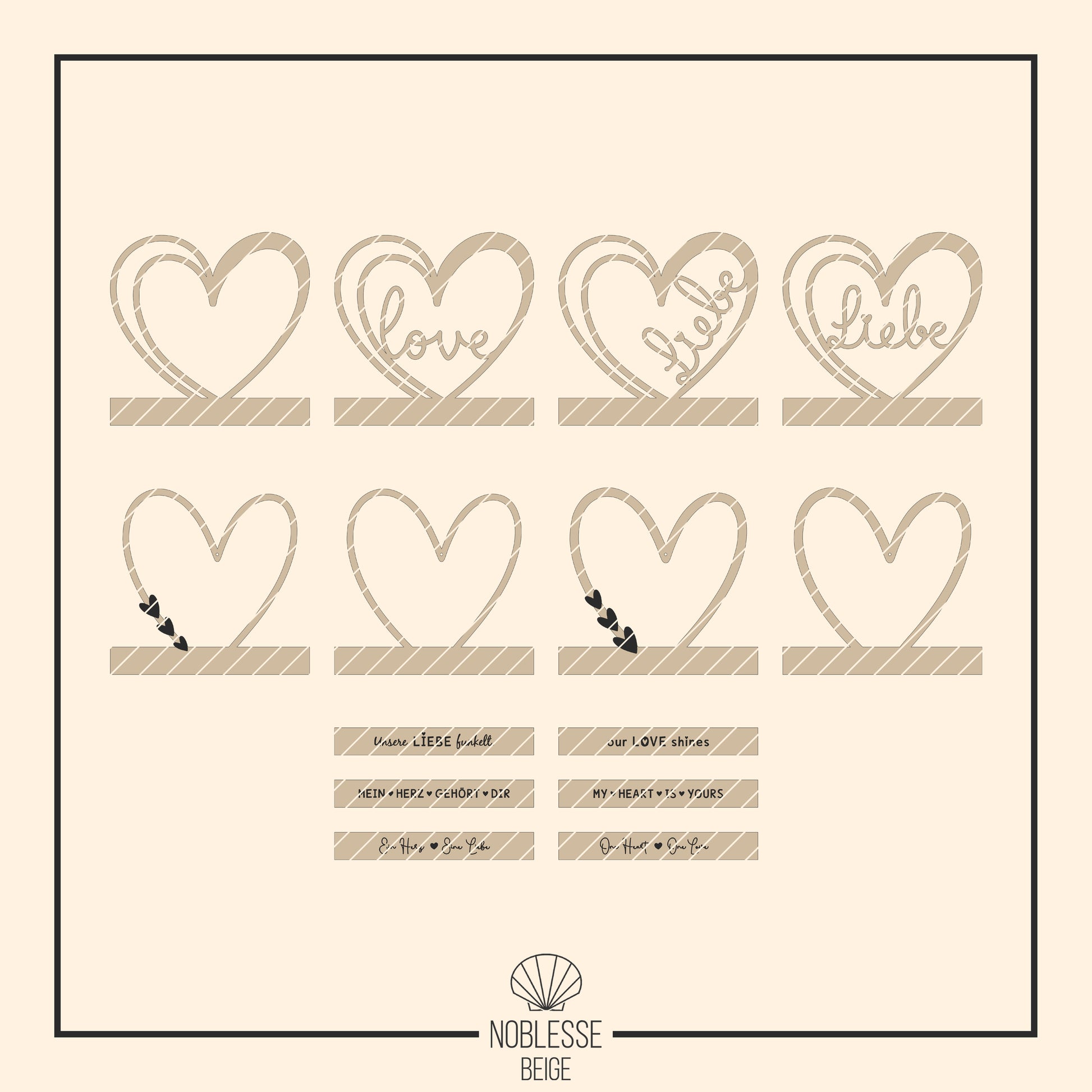 In dieser Datei erhalten Sie ein Bundle aus 8 unterschiedlichen Herzen bzw. Herz-Rahmen, passend für Klötzchen mit den Maßen 22x160mm und 23x160mm. Vier Klötzchen Einschieber sind als Herz mit einer Doppel-Linien-Kontur gestaltet und enthalten die deutschen handgezeichneten Schriftzüge LIEBE sowie den englischen Schriftzug LOVE. Dieses Herz ist ebenfalls leer enthalten, sodass Sie es mit eigenen Namen oder Begriffen personalisieren können. In die restlichen 4 Herzen mit schmalem Herzrahmen können Sie einen Kristall einhängen und diese als Sonnenfänger nutzen. Natürlich können Sie das Loch auch löschen und statt dem Sonnenfänger mit einem Namen oder Begriff personalisieren. Außerdem sind dazu passende Klötzchen Gravuren mit den deutschen Texten: EIN HERZ - EINE LIEBE, MEIN HERZ GEHÖRT DIR, UNSERE LIEBE FUNKELT und englischen Texten: ONE HEART - ONE LOVE, MY HEART IS YOURS und OUR LOVE SHINES enthalten. Sie können die Einschieber auch mit eigenen Texten personalisieren.