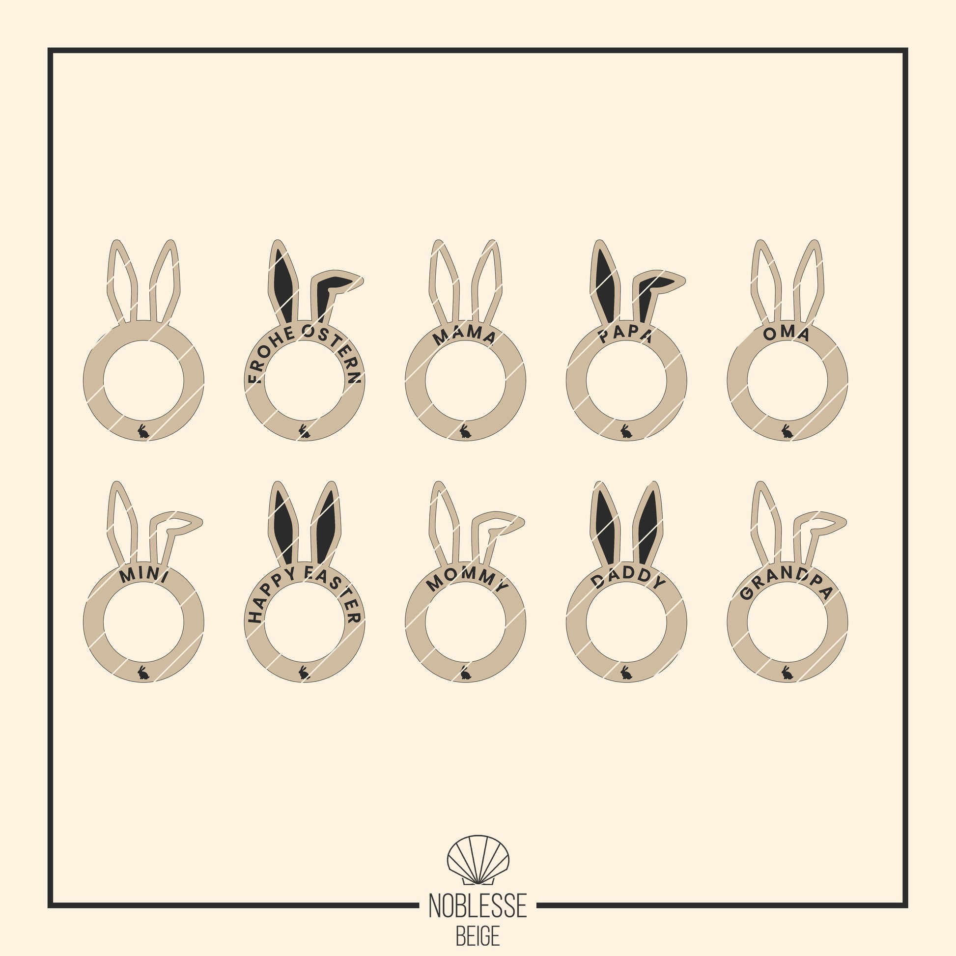 In dieser Datei erhalten Sie ein wundervolles Bundle von Serviettenhaltern mit Hasenohren bzw. süßem Knickohr mit vorgefertigten passenden Texten für die ganze Familie (insgesamt 48 Varianten). Sie erhalten die dekorativen Servietten Ringe mit 4 unterschiedlichen Designs: Cut Out Hasenohren ausgeschnitten, Hasenohren graviert, Cut Out Knickohr ausgeschnitten und Knickohr graviert. Außerdem erhalten Sie die Ringe mit den deutschen Texten: FROHE OSTERN, MAMA, PAPA, MINI, OPA, OMA und mit den englischen Texten: HAPPY EASTER, MOMMY, DADDY, GRANDMA und GRANDPA. Natürlich können Sie die Halter auch gerne mit eigenen Texten oder Namen personalisieren. Alle Halter haben einen niedlichen kleinen Osterhasen unten am Ring, den Sie selbstverständlich auch löschen können, wenn Ihnen das Design ohne Hase besser gefällt.