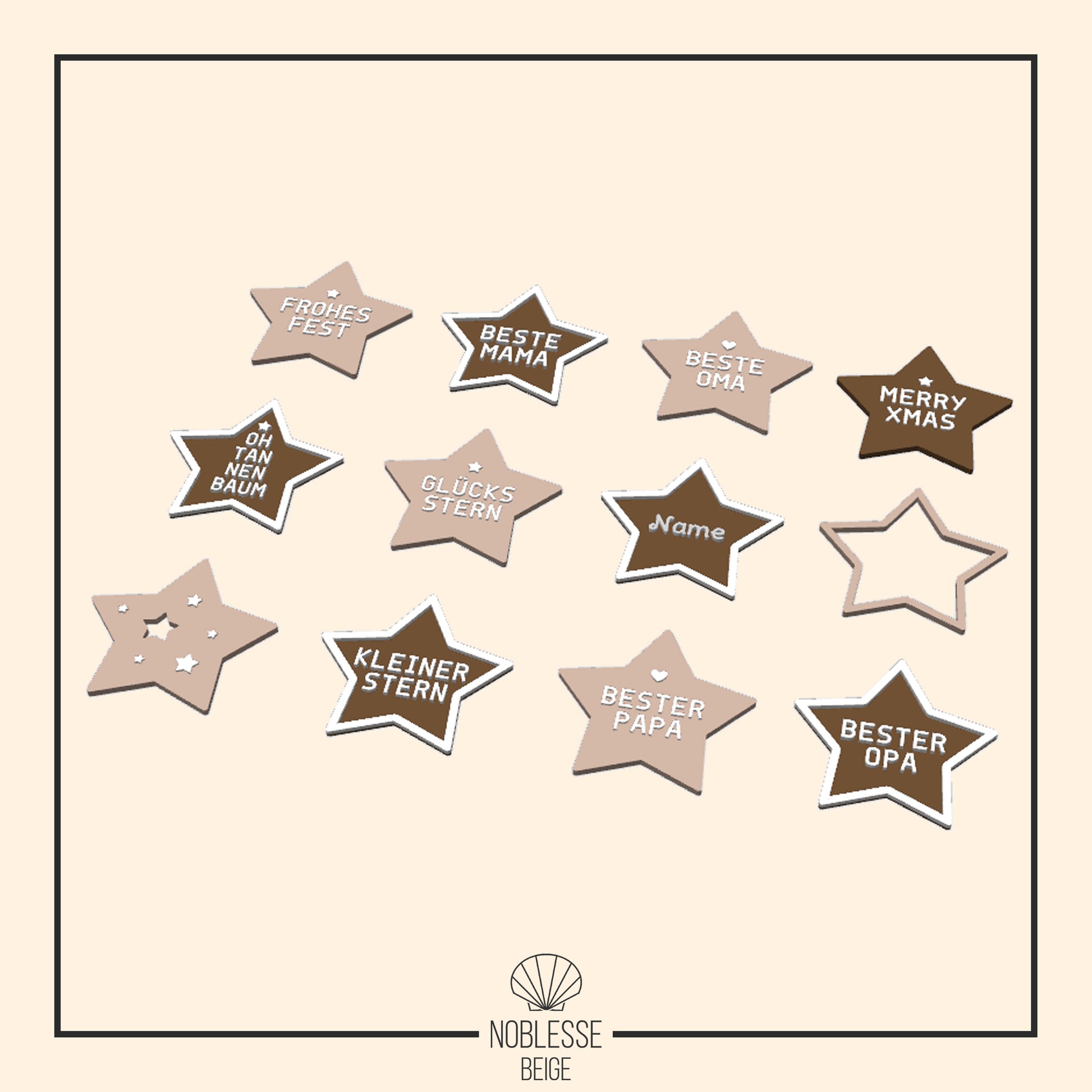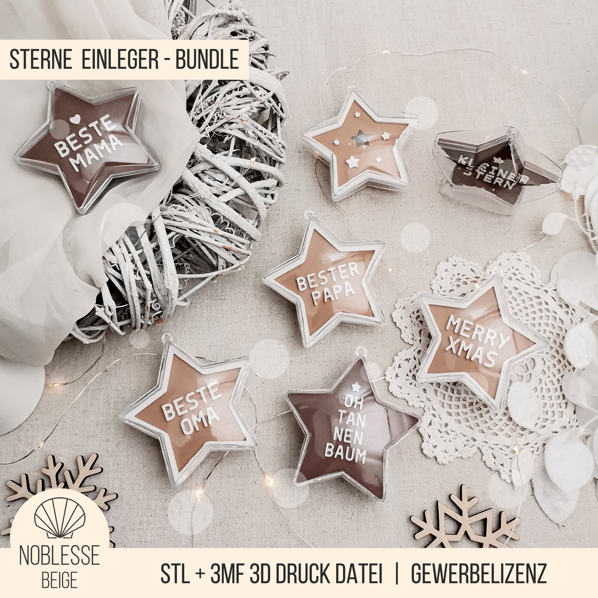 In dieser Datei erhalten Sie ein großes Bundle von zauberhaften Stern Einlegern mit verschiedenen weihnachtlichen Botschaften, passend für zweischalige Sternenkugeln (Maßangabe der Hersteller 8cm!) aus transparentem Acryl. Mit der Datei erhalten Sie mehrere Links wo Sie die passenden Sternenkugeln erhalten. Sie können die Einleger aber auch jederzeit skalieren und so einfach an andere Kugelgrößen anpassen. In der Datei finden Sie insgesamt 27 tolle Stern Inlays in 2 unterschiedlichen Designs (Stern und Stern mit Rahmen). Neben Texten wie MERRY XMAS, FROHES FEST, OH TANNENBAUM, ZAUBERSTERN, GLÜCKSSTERN, WUNSCHSTERN, und KLEINER STERN erhalten Sie BESTE MAMA, BESTE OMA, BESTER PAPA und BESTER OPA, ein Sterne Design und einen Stern-Rahmen. Außerdem erhalten Sie beide Stern Designs als leere Variante (blanko), die Sie mit eigenen Texten oder Namen personalisieren können.